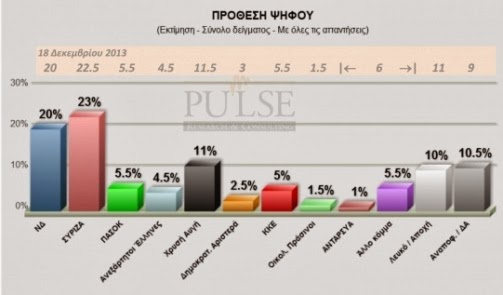 Προβάδισμα 3% δίνει στον ΣΥΡΙΖΑ δημοσκόπηση της Pulse Posted: 23 Jan 2014 12:14 AM PST Σαφές προβάδισμα του ΣΥΡΙΖΑ έναντι της ΝΔ με διαφορά 3% τόσο στην πρόθεση ψήφου όσο και στην αναγωγή της επί των εγκύρων δίνει δημοσκόπηση της Pulse RC για την εφημερίδα Ποντίκι. Συγκεκριμένα, στην πρόθεση ψήφου η ΝΔ συγκεντρώνει 20%, ο ΣΥΡΙΖΑ 23%, το ΠΑΣΟΚ 5,5%, οι Ανεξάρτητοι Έλληνες 4,5%, η Χρυσή Αυγή 11%, η Δημοκρατική Αριστερά 2,5%, το ΚΚΕ 5% οι Οικολόγοι Πράσινοι 1,5% και ο ΑΝΤΑΡΣΥΑ 1%. Στην Αναγωγή επί των εγκύρων (εκτίμηση χωρίς αποχή, λευκό και άκυρο) η ΝΔ συγκεντρώνει 22,5%, ο ΣΥΡΙΖΑ 25,5%,το ΠΑΣΟΚ 6%, οι Ανεξάρτητοι Έλληνες 5%, η Χρυσή Αυγή 12%, η Δημοκρατική Αριστερά 3%, το ΚΚΕ 5,5% οι Οικολόγοι Πράσινοι 1% και ο ΑΝΤΑΡΣΥΑ 1%. |